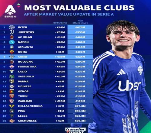 德轉(zhuǎn)更新后意甲俱樂(lè)部身價(jià)排名: