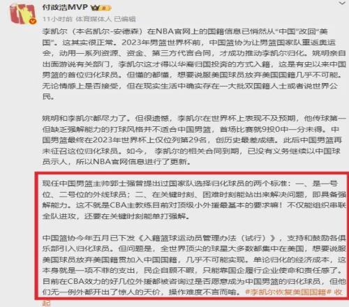 李凱爾目前仍是中國國籍,意味著未來依然有資格代表中國男籃出戰(zhàn)FIBA比賽。