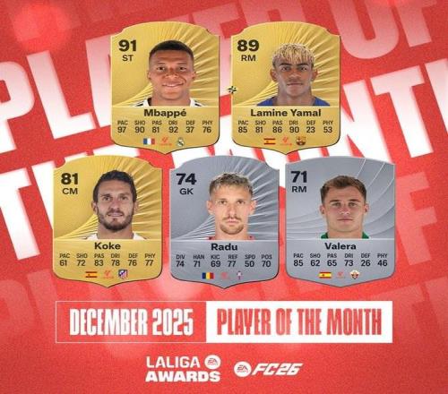 北京時間12月24日,西甲12月最佳球員候選名單公布,這5名球員為姆巴佩、亞馬爾、科克、拉杜、巴萊拉。本月評選范圍為聯(lián)賽第15-17輪。
