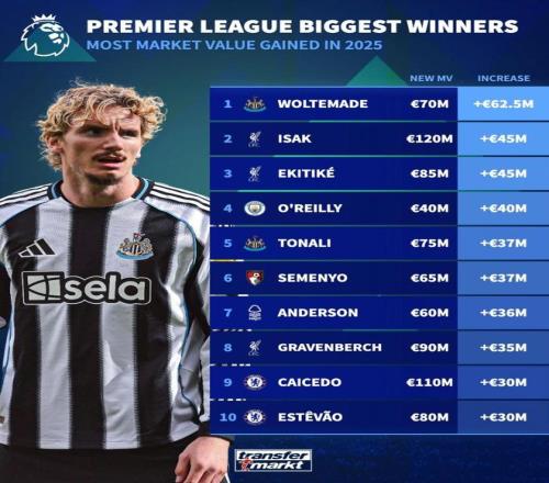 北京時(shí)間12月25日,德轉(zhuǎn)列出了英超球員中2025年漲幅最高的10名球員,今夏加盟紐卡斯?fàn)柭?lián)的沃爾特馬德過(guò)去這一年里身價(jià)暴漲6250萬(wàn)歐元高居第一,伊薩克和?;倏松蠞q4500萬(wàn)歐元并列第二。