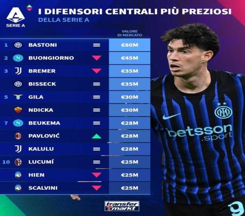 意甲中衛(wèi)身價(jià)前10:巴斯托尼8000萬斷檔第1,早安哥4500萬第2