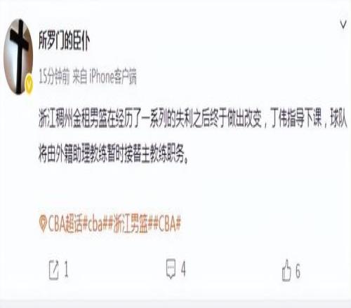 據(jù)媒體人所羅門的臣仆報道,浙江男籃在經(jīng)歷了一系列的失利之后終于做出改變,主帥丁偉指導(dǎo)下課,球隊將由外籍助教(亞歷山德羅斯·法萊卡斯)暫時接替主教練職務(wù)。不過這一消息還未被浙江俱樂部確認,也許稍后會進行官宣。
