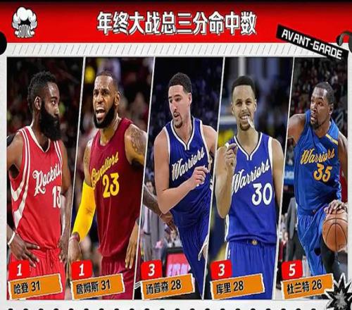 在比賽進行到第一節(jié)時,詹姆斯投中三分球。自此,他獨享NBA圣誕大戰(zhàn)歷史上的三分王稱號。此前,他與詹姆斯-哈登同以31記三分球并列排在第一名。