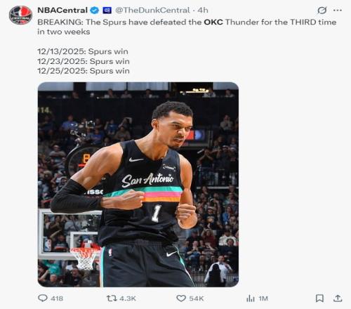北京時間12月26日,NBA年終大戰(zhàn),馬刺以117-102大勝雷霆拿到八連勝。這場比賽馬刺是一直壓制雷霆,首節(jié)領(lǐng)先5分,半場拉開到9分,第三節(jié)一波流拉開到15分,末節(jié)馬刺牢牢掌控大局。聯(lián)盟第一的雷霆毫無還手之力,文班亞馬再一次壓制了SGA,這讓SGA的連莊MVP蒙上陰影。