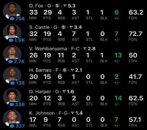 馬刺福克斯、卡斯?fàn)枴⒐耆笮l(wèi)齊飆,主打一個分工合作,干活不累,??怂挂粋€包攬上半場,卡斯?fàn)?、哈珀統(tǒng)領(lǐng)下半場,用突破把防守天下第一的雷霆突成了突突。