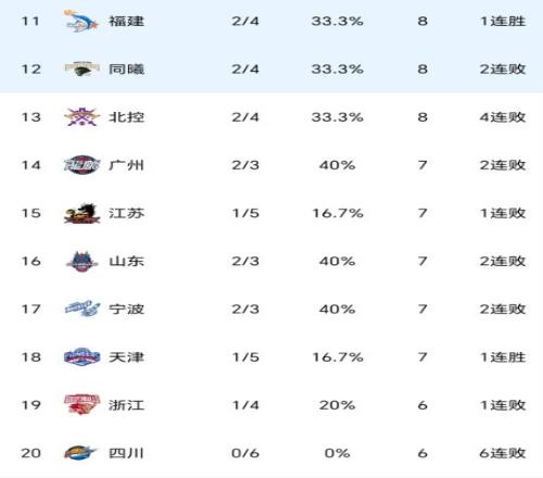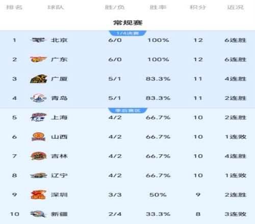 北京隊開局五輪全勝,強(qiáng)勢領(lǐng)跑積分榜,因廣廈隊多賽一輪,所以暫時升至第一,只要北京隊繼續(xù)連勝,就能奪回榜首位置。